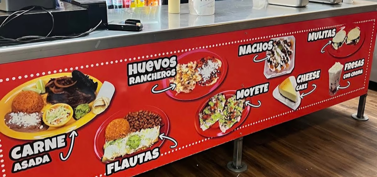- Breakfast: Morning selections include several types of burritos—Sausage, Ham, Chorizo, and Breakfast Burrito—along with Chilaquiles Rojos or Verdes, Torta De Huevo with Ham, and Huevos Rancheros.